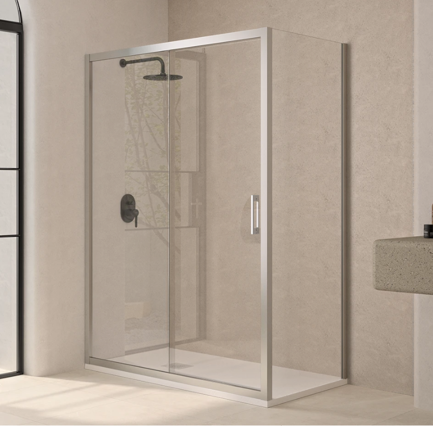 La mampara de ducha Doccia ST Edimburgo combina elegancia, resistencia y practicidad en un diseño frontal con una hoja corredera, una hoja fija y un lateral fijo, ideal para platos de ducha amplios y espacios modernos de baño.