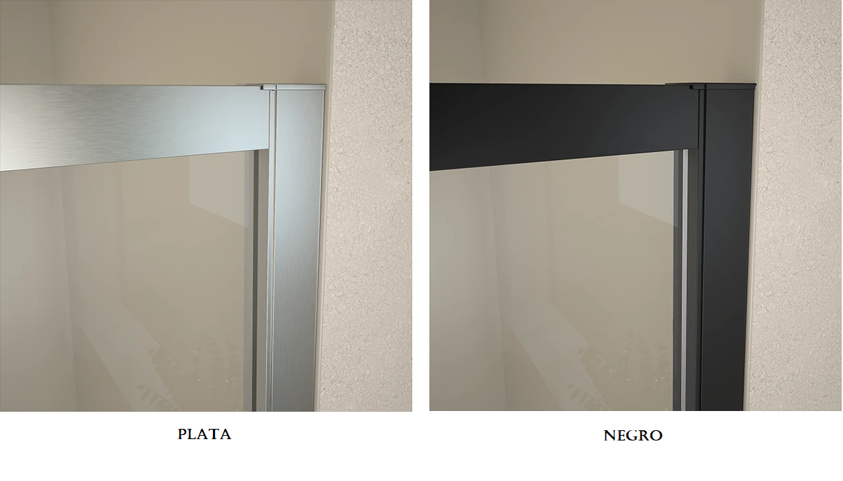 Está compuesta por dos hojas correderas centrales y dos hojas fijas laterales, diseñadas para ofrecer un acceso cómodo y una gran amplitud de paso. Su perfilería de aluminio de alta calidad está disponible en color plata brillo o negro mate, adaptándose a todo tipo de estilos de baño, desde los más clásicos hasta los más contemporáneos.